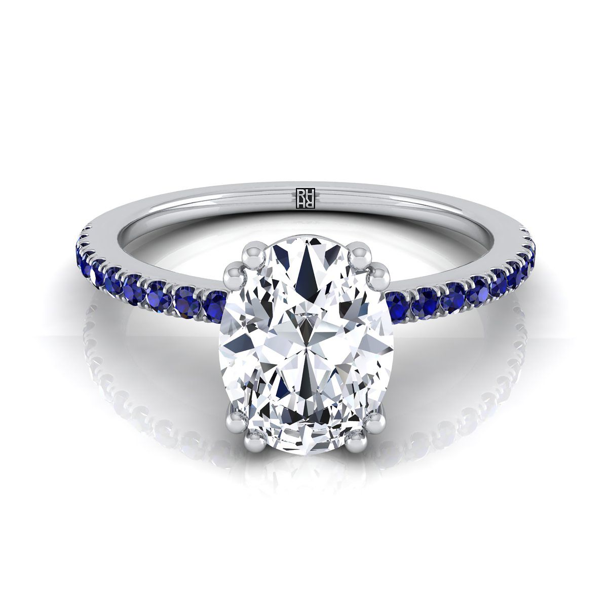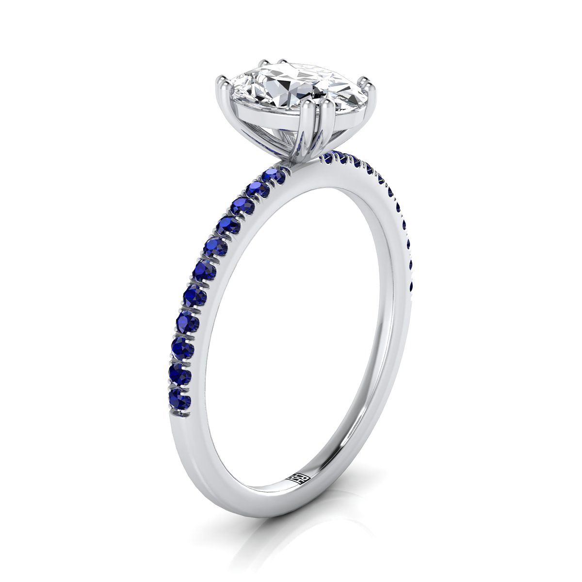 แสดงสไตล์อย่างสง่างาม แหวนตั้งครึ่งวงเพชรรูปไข่นี้มีการจัดวางแซฟไฟร์กลม 22 เม็ดอย่างสวยงามในแพลตตินัม