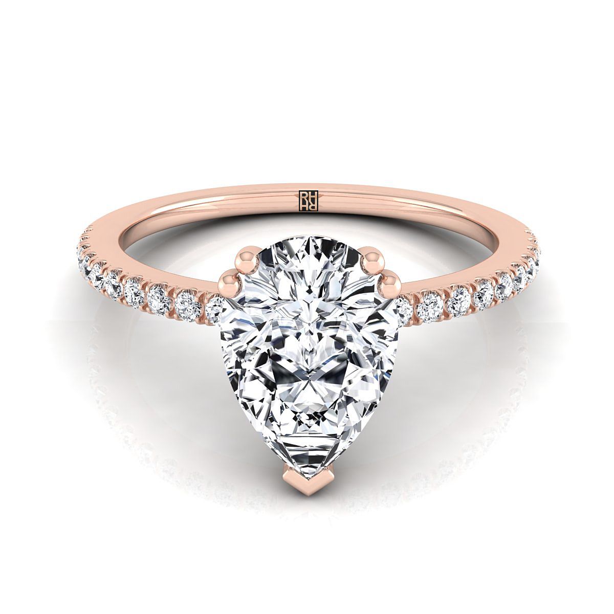 แหวนหมั้นเพชรทรงลูกแพร์กลางทองกุหลาบ 14K แบบฝรั่งเศสเรียบง่าย ประดับเพชรแบบปาเว่สองกรงเล็บ - 1/6ctw