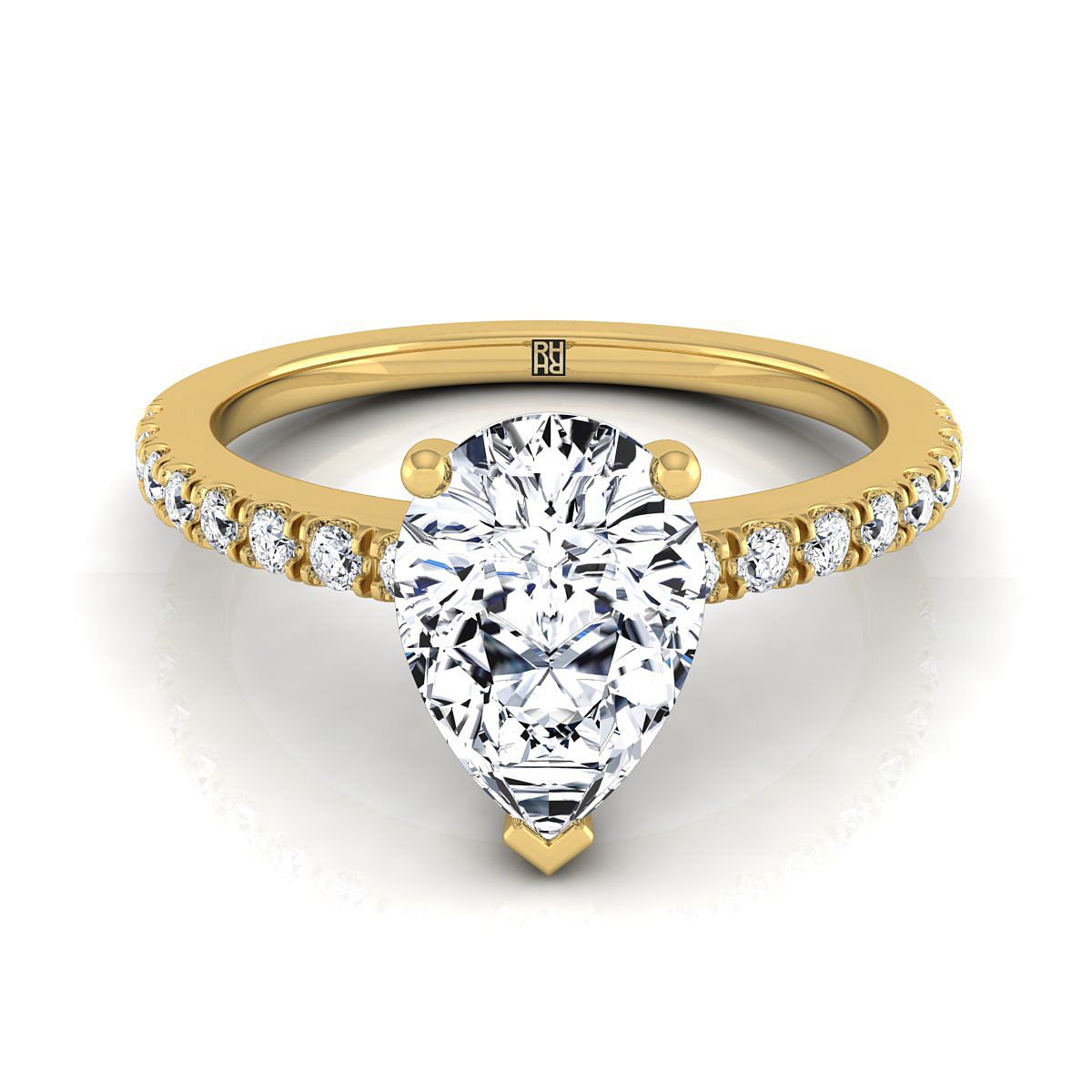 แหวนหมั้นเพชรแบบเรียบง่ายกลางรูปทรงลูกแพร์ทองคำเหลือง 18K ประดับเพชรแบบปาเว่เส้นตรง - 1/5ctw