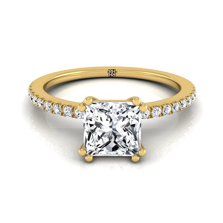 แหวนหมั้นเพชรทรงเจ้าหญิงแบบฝรั่งเศสประดับเพชรเม็ดเล็กสองกรงเล็บทองคำเหลือง 14K - 1/6ctw