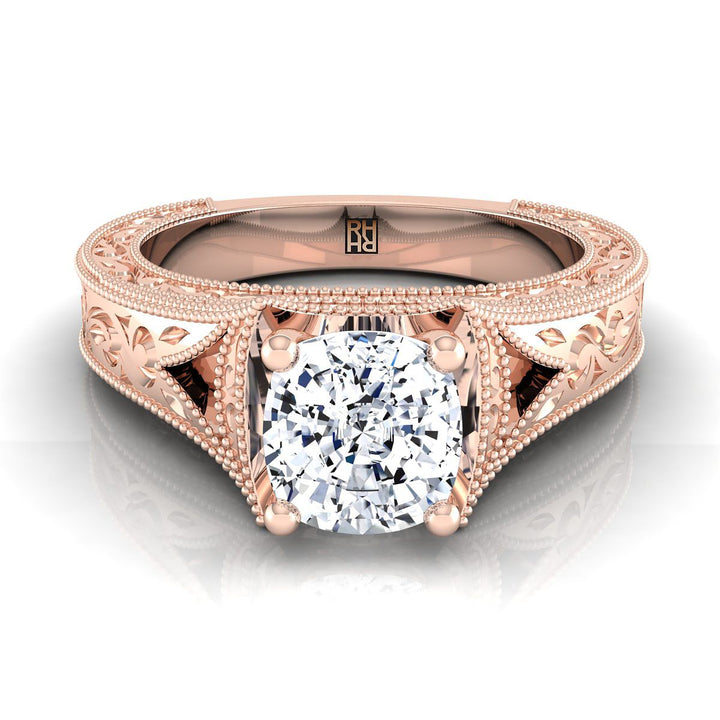 ความสง่างามที่เรียบง่าย แหวนหมั้นเพชรทรงหมอนนี้ในทองคำกุหลาบ 14k มีการออกแบบที่ได้รับแรงบันดาลใจจากของเก่า พร้อมการแกะสลักที่มีเสน่ห์และการตกแต่งแบบมิลล์เกรนคลาสสิก