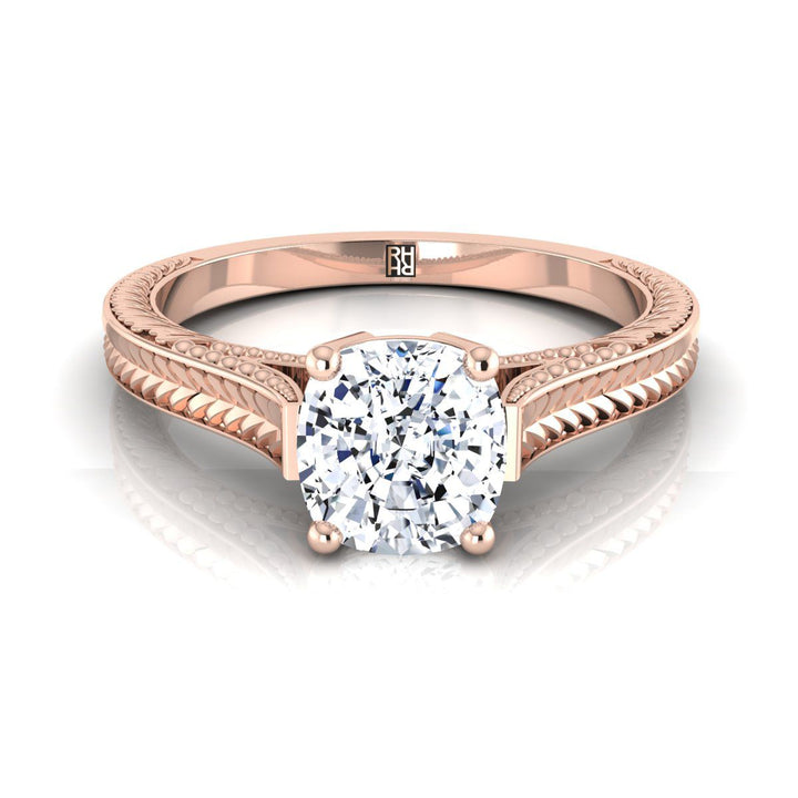 ความสง่างามที่เรียบง่าย แหวนหมั้นเพชรทรงสี่เหลี่ยมนี้นำเสนอการออกแบบที่ได้รับแรงบันดาลใจจากของเก่าที่มีการแกะสลัก พร้อมการตกแต่งแบบมิลล์เกรนคลาสสิกในทองคำกุหลาบ 14k