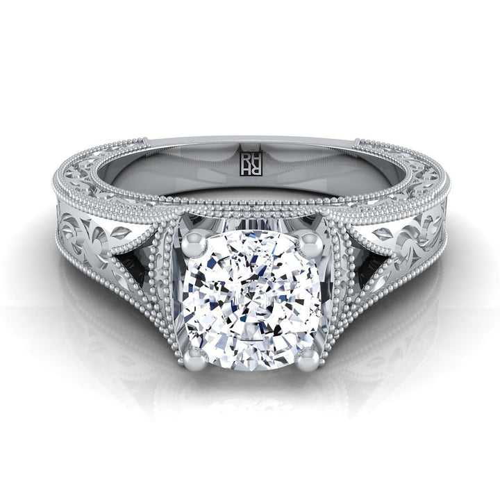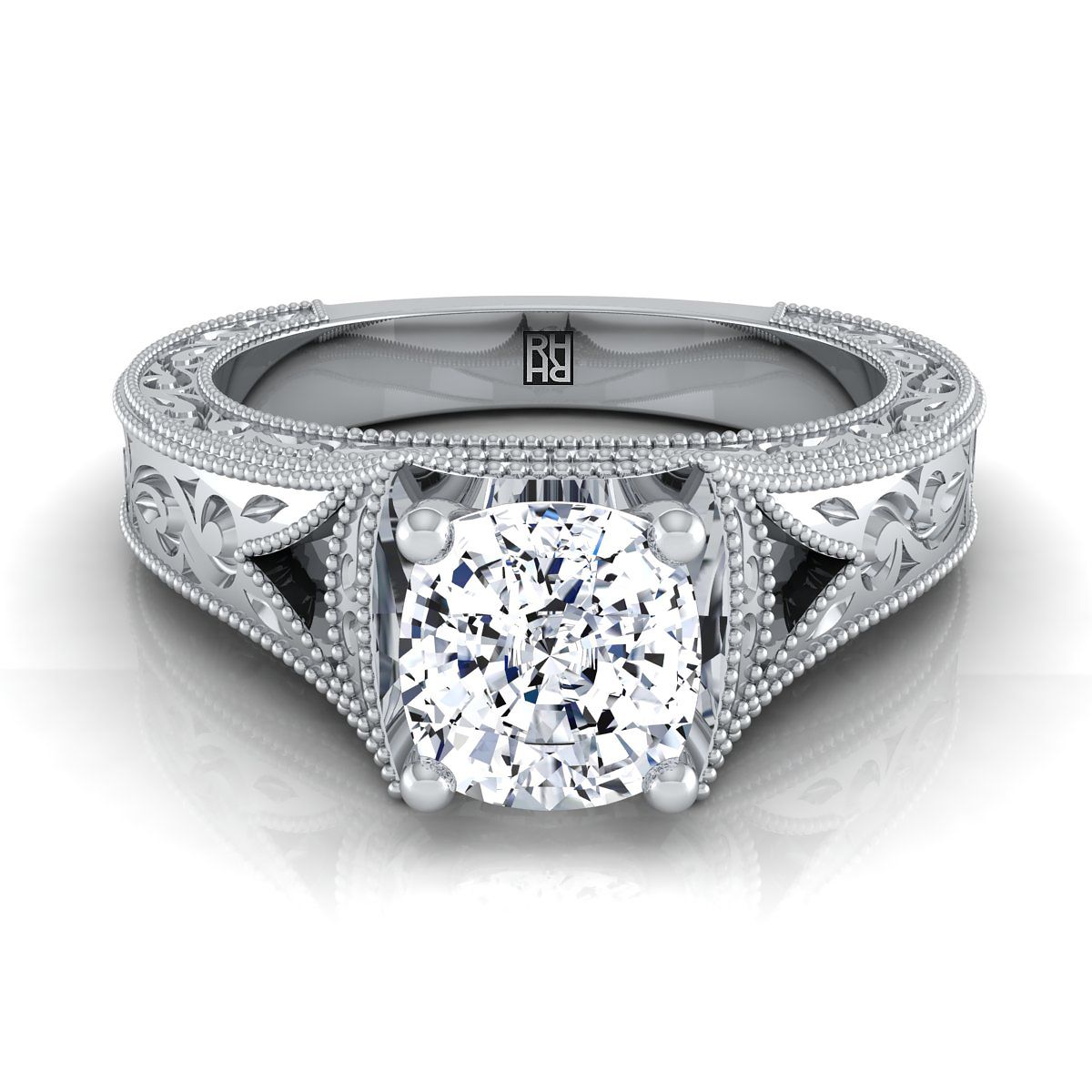 ความสง่างามที่เรียบง่าย แหวนหมั้นเพชรทรงหมอนนี้ในทองคำขาว 18 กะรัต แสดงให้เห็นถึงการออกแบบสลักลายที่ได้รับแรงบันดาลใจจากโบราณ พร้อมด้วยการตกแต่งขอบแบบมิลเกรนคลาสสิก