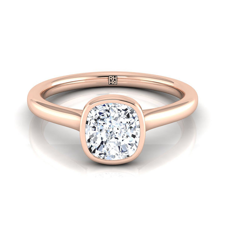 ความสง่างามที่เรียบง่าย แหวนหมั้นเพชรนี้มีการตั้งค่าเพชรทรงสี่เหลี่ยมจัตุรัสแบบเบเซลในการตั้งค่าโรสโกลด์ 14k คลาสสิก