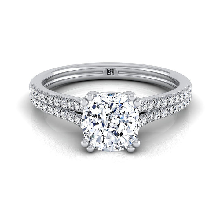 แหวนหมั้นฝรั่งเศสประดับเพชรแบบแถวคู่และหนามแหลมคู่ Cushion แพลตตินัม - 1/6ctw