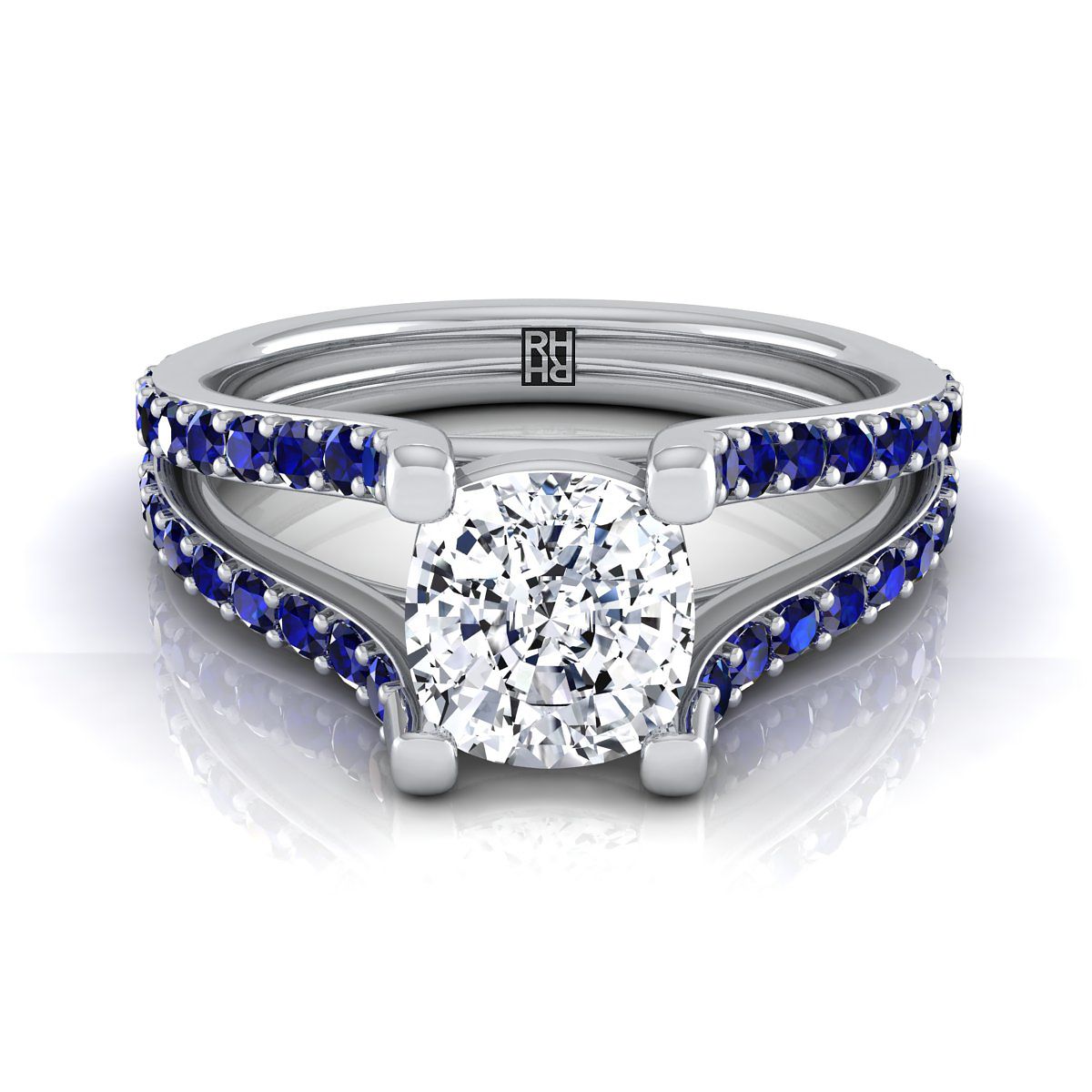 แหวนหมั้นพลอยไพลินแบบแยกขา ประดับด้วยเพชรเม็ดรองแบบหมุดทองคำขาว
