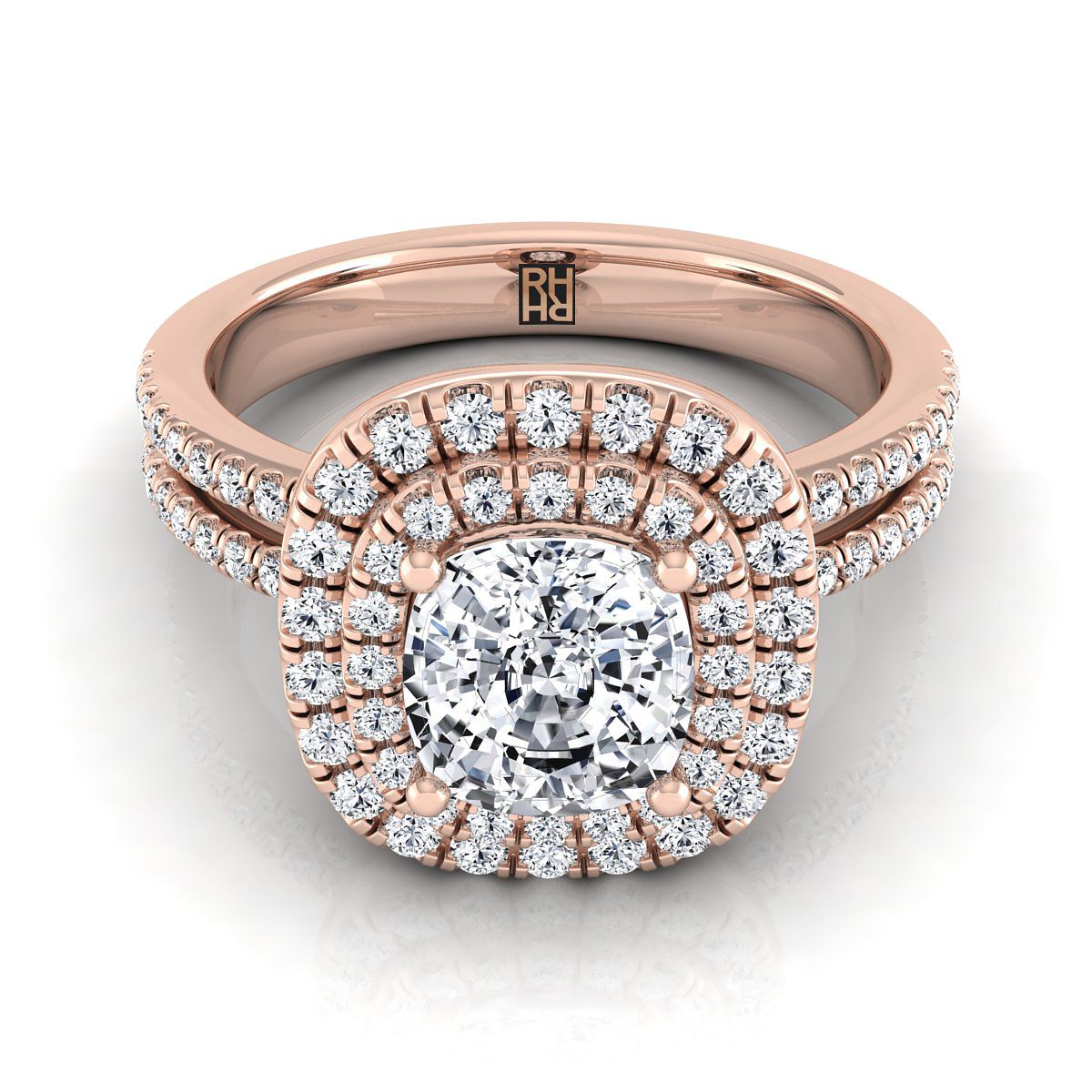 สร้างขึ้นอย่างประณีต แหวนหมั้นแบบ Double Pave Halo Cushion Cut นี้มีเพชร Brilliant Cut (h-i/vs 0.45ctw) ที่ตั้งอยู่ในรูปแบบ 14k Rose Gold ที่คลาสสิกอย่างสวยงาม