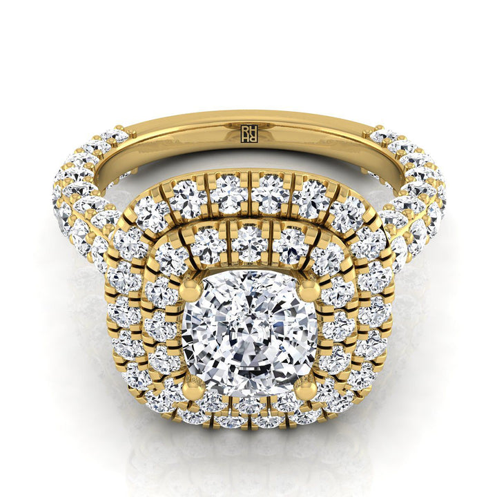 แสดงออกถึงสไตล์ที่สง่างาม แหวนหมั้นแบบคัทคูชั่นคู่ฮาโลที่ประดับด้วยเพชรเจียระไนแบบบริลเลียนต์ (h-i/vs 2.15ctw) พร้อมกับแถบเพฟที่ประณีต ติดตั้งในตัวเรือนทองคำเหลือง 18k