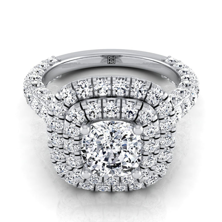 แหวนหมั้นเพชรแพลทินัมคูชันแบบหนาและหรูหราพร้อมฮาโลคู่สไตล์ฝรั่งเศสปาเว - 2ctw