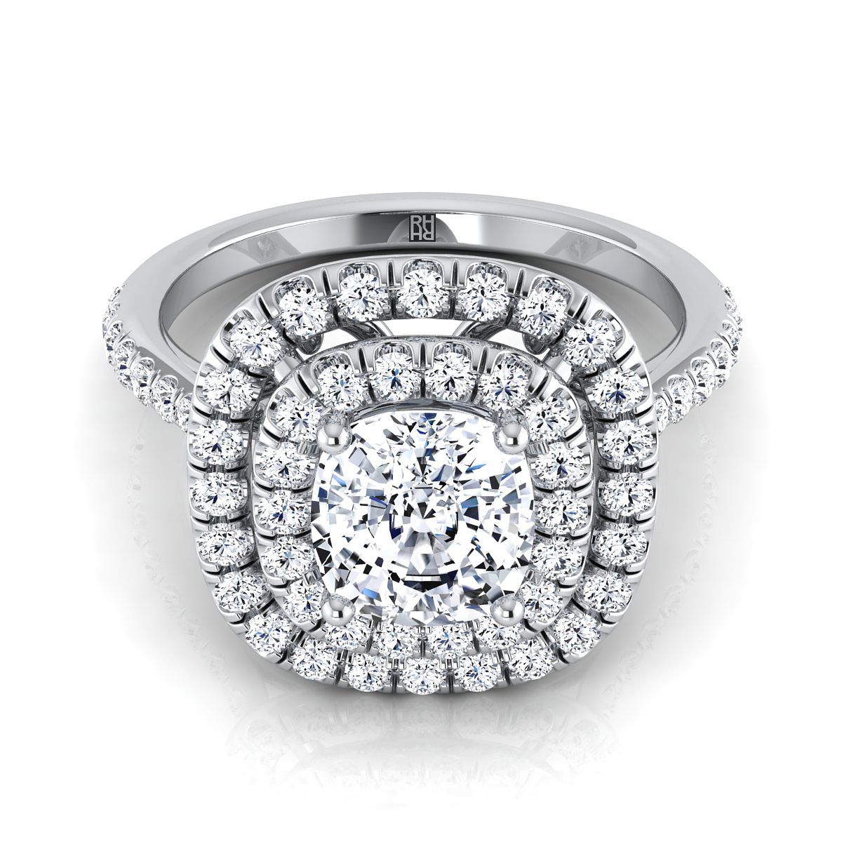 แหวนหมั้นรูปทรงหมอนที่ประดับด้วยเพชรเจียระไนแบบดับเบิลฮาโลอย่างประณีต แสดงให้เห็นเพชรเจียระไนประกายแวววาว (h-i/vs 0.50ctw) ที่ประดับอย่างสวยงามในตัวเรือนทองคำขาว 18 กะรัตแบบคลาสสิก