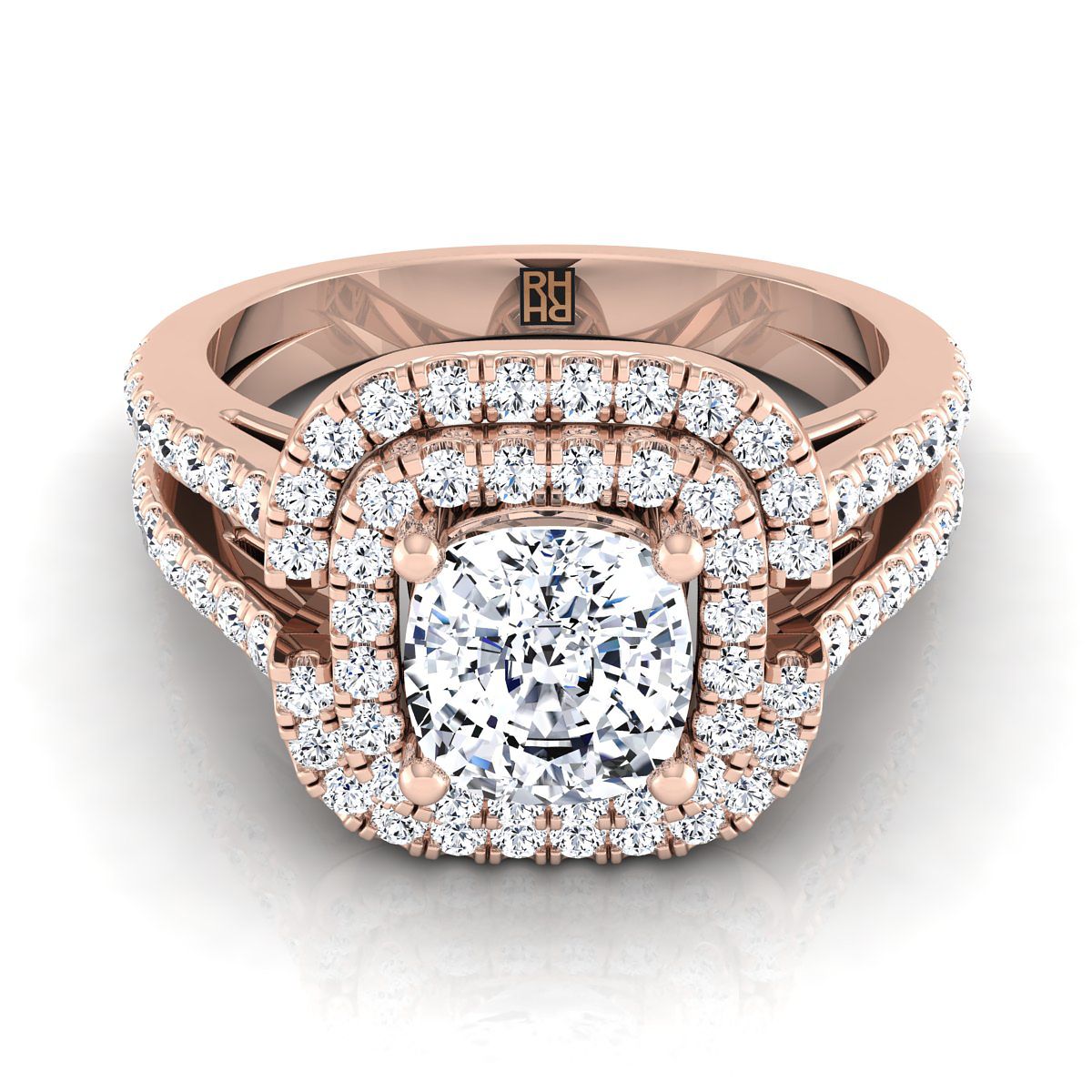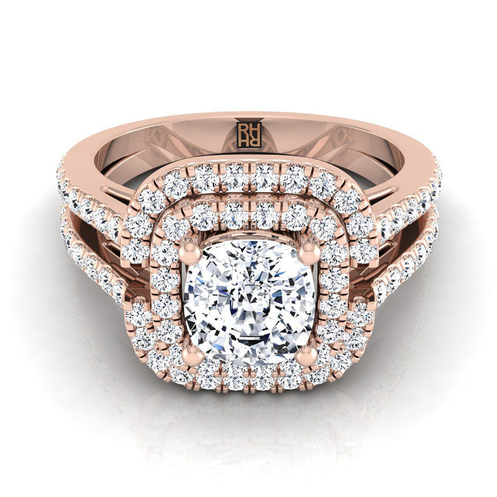 สร้างสรรค์อย่างสวยงาม แหวนหมั้นแบบ Cushion Cut Double Halo นี้พร้อมด้วย Pave Split Shank แสดงให้เห็นถึงเพชร Brilliant Cut (h-i/vs 0.66ctw) ที่ตั้งอย่างเชี่ยวชาญในกรอบทองกุหลาบ 14k แบบคลาสสิก.