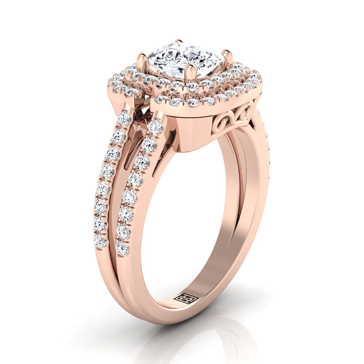 แหวนหมั้นทองคำชมพู 14K แบบเบาะเปิดที่มีเพชรคู่แถวแยกและฮาโล -5/8ctw