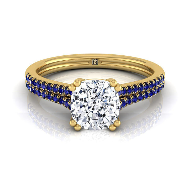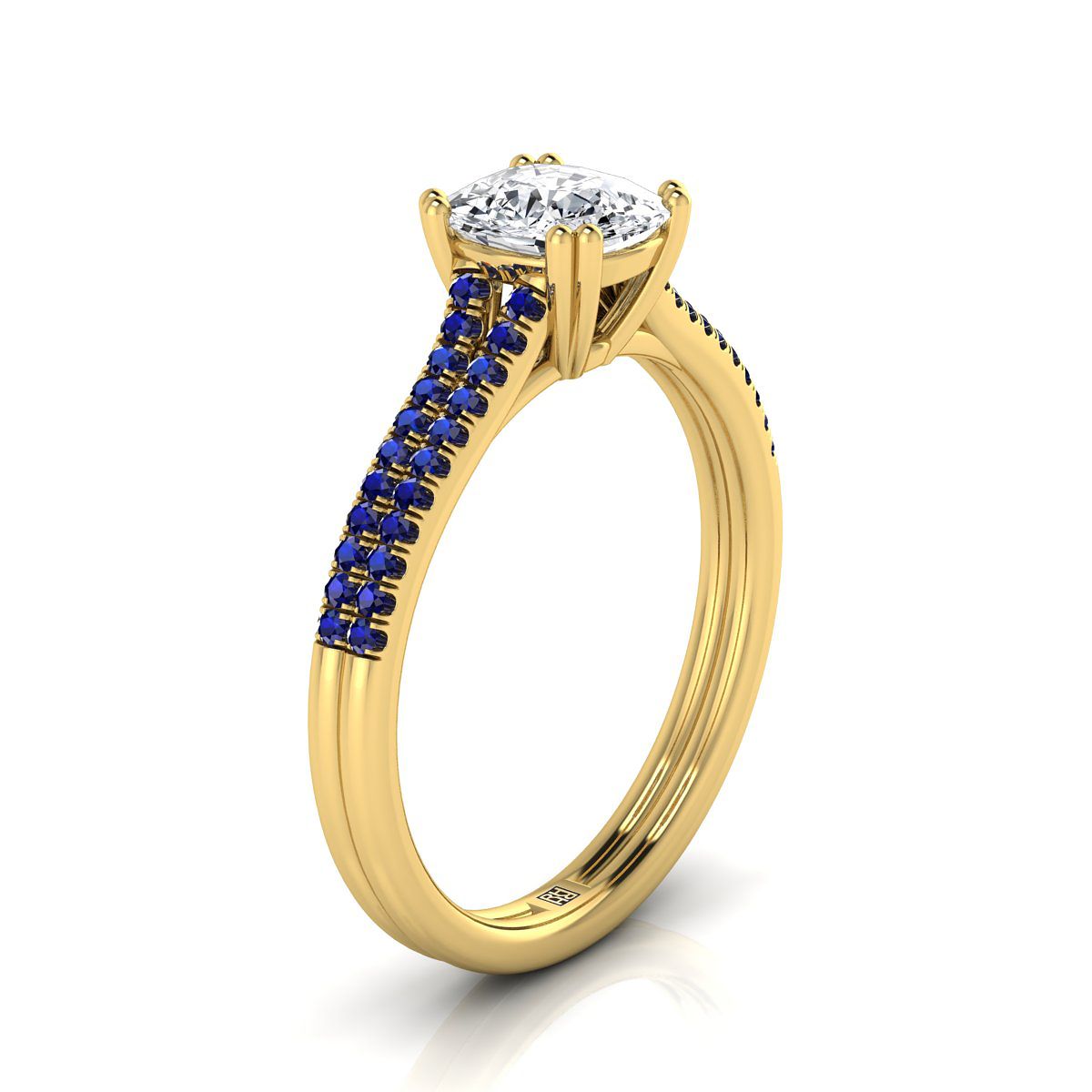 แหวนหมั้นเพชรทรงหมอนที่ทำด้วยมืออย่างประณีตนี้ โชว์ความงดงามของไพลินทรงกลมที่ประดับด้วยไมโครยูเพฟในตัวเรือนทองคำเหลือง 14 กะรัตแบบคลาสสิกอย่างสวยงาม