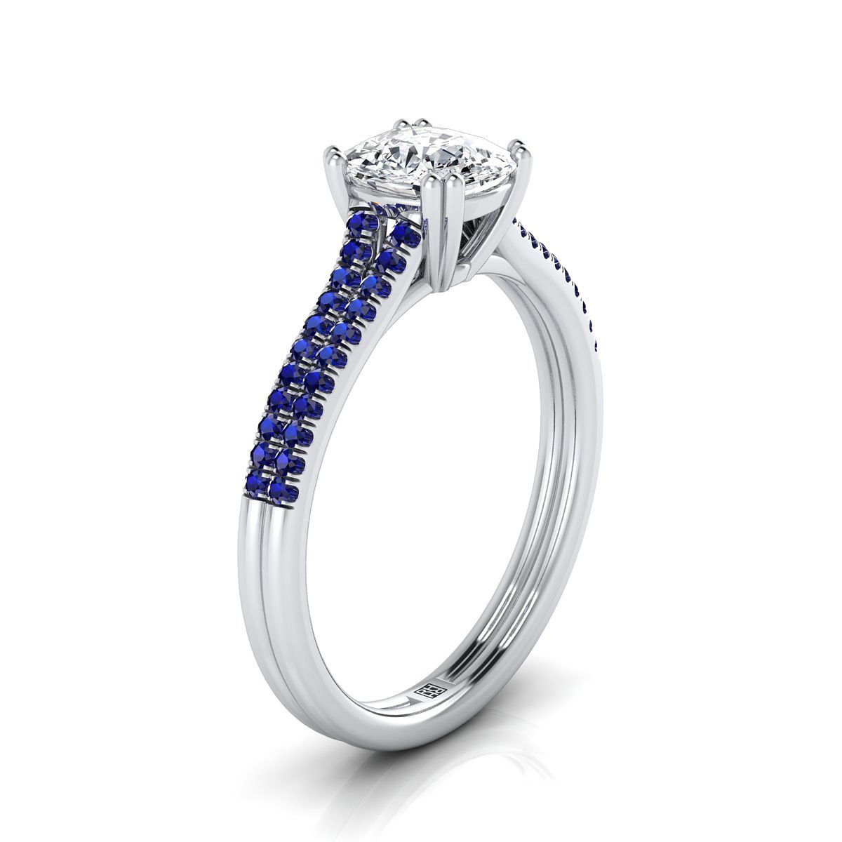 แหวนหมั้นเพชรทรงหมอนที่ทำด้วยมืออย่างประณีตนี้ โชว์ความงดงามของไพลินทรงกลมที่ประดับด้วยไมโคร ยู เพฟอย่างสวยงามในตัวเรือนทองคำขาว 18 กะรัตแบบคลาสสิก