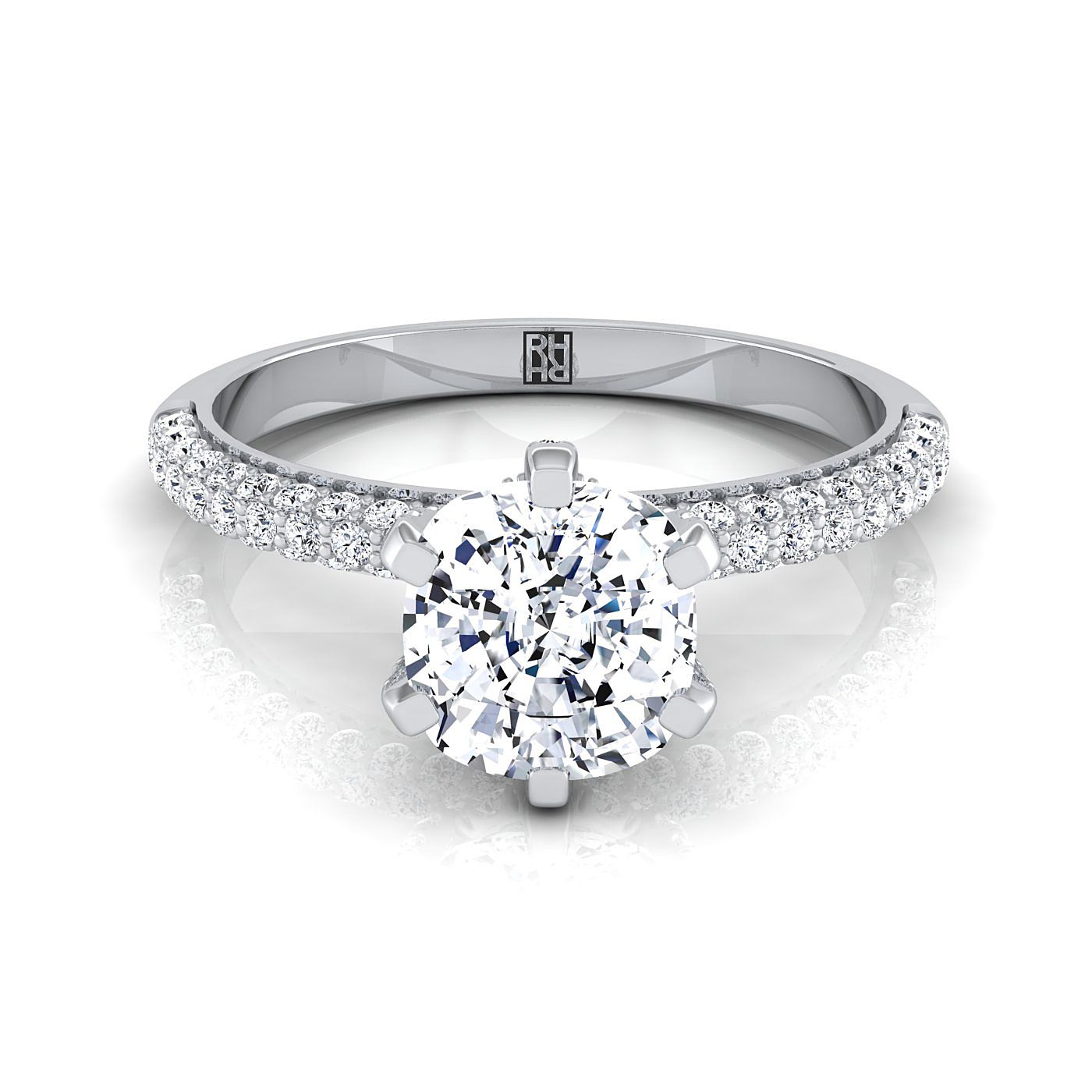 ผลิตด้วยมืออย่างประณีตในทองคำขาว 18 กะรัต แหวนหมั้นเพชรทรงหมอนนี้แสดงให้เห็นถึงเพชรเจียระไนแบบ Brilliant Cut (h-i/vs 0.45ctw) ที่ประดับอย่างสวยงามในตัวเรือนคลาสสิกนี้
