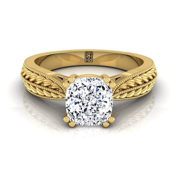 แหวนหมั้นดีไซน์โบราณทรงหมอนพร้อมลวดลายเชือกเล็กและขอบมิลเกรนในทองคำเหลือง 14 กะรัต