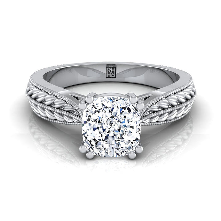 แหวนหมั้นเพชรทรงหมอนพร้อมดีไซน์ข้าวสาลีเล็กและกรอบประดับเม็ดบีดในแพลทินัม