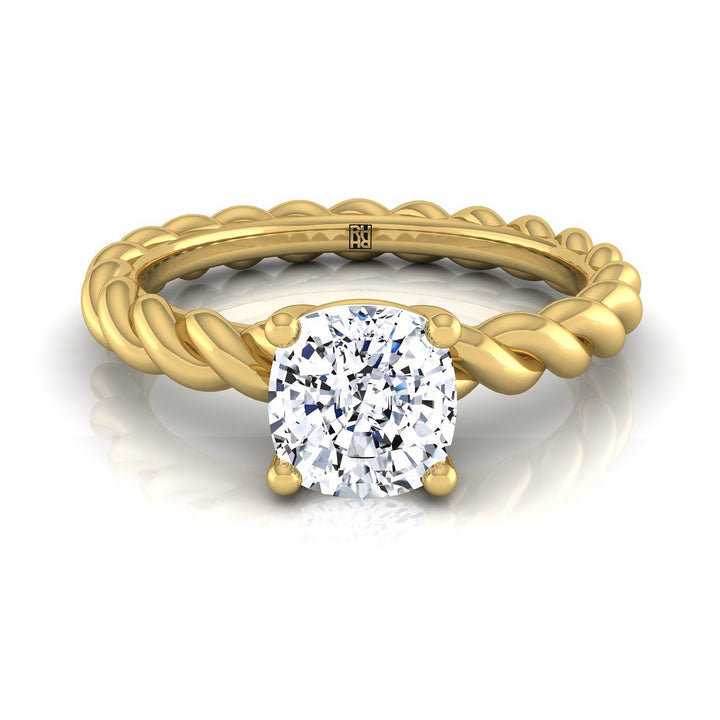 ความสง่างามที่เรียบง่าย แหวนหมั้นเพชรนี้นำเสนอเพชรทรงหมอนแบบโซลิแทร์พร้อมดีไซน์เชือกที่ก้านแหวนในตัวเรือนทองคำเหลือง 14 กะรัตคลาสสิก