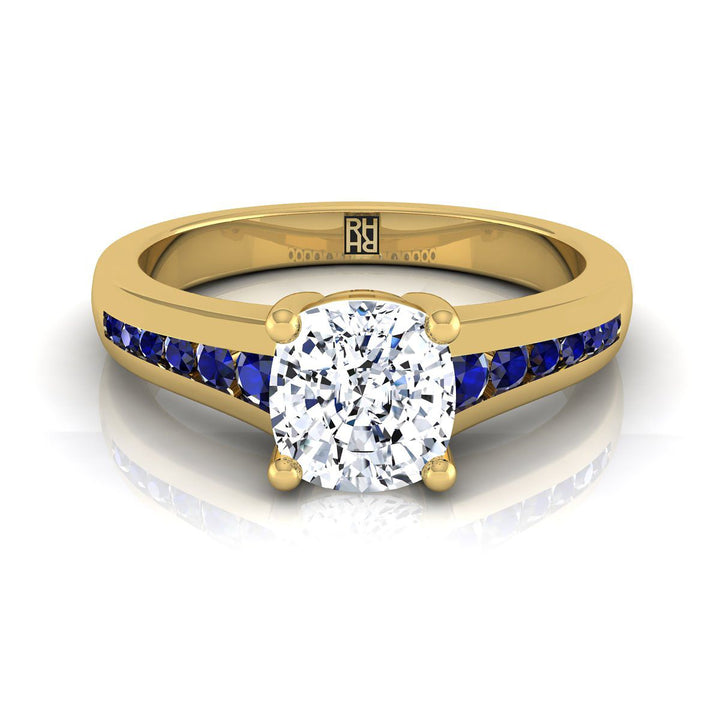 ผลิตด้วยมืออย่างประณีตในทองคำแท้ 18k สีเหลือง แหวนหมั้นเพชรทรงหมอนนี้ประดับด้วยแซฟไฟร์แบบฝังร่อง สร้างฐานที่สมบูรณ์แบบสำหรับเพชรเม็ดเดียวที่จะคงอยู่ตลอดชีวิต