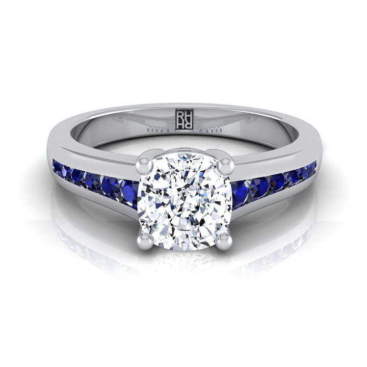 ผลิตด้วยมืออย่างประณีตในแพลตตินัม แหวนหมั้นเพชรทรงหมอนนี้พร้อมด้วยไพลินที่ฝังแบบช่อง สร้างการตั้งค่าที่สมบูรณ์แบบสำหรับเพชรเม็ดเดียวที่จะคงอยู่ตลอดชีวิต