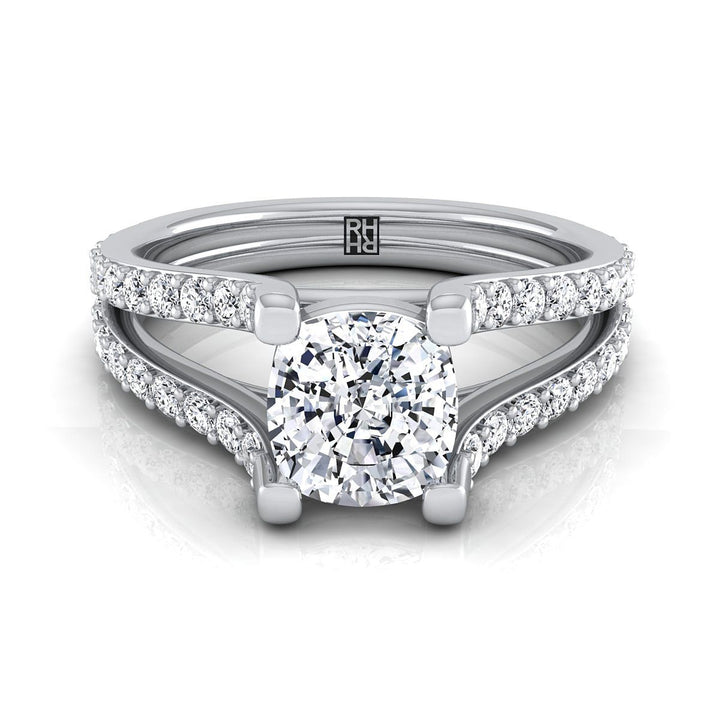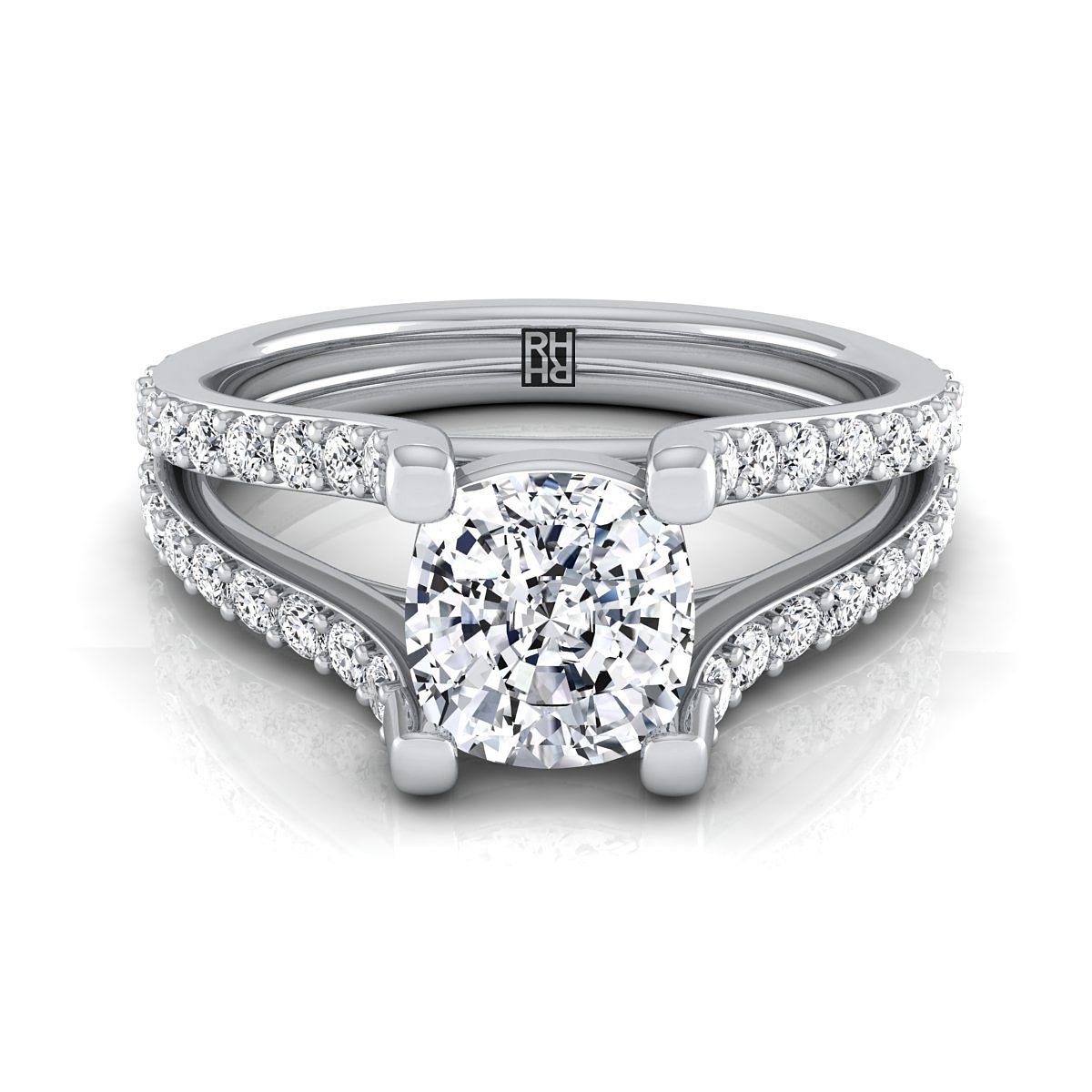 คลาสสิกและสง่างาม แหวนหมั้นเพชรทรงหมอนแพลทินัมนี้แสดงให้เห็นถึงเพชรเจียระไนแบบ Brilliant Cut (h-i/vs 0.58ctw) ที่ประดับอย่างสวยงามในแบบ Pave Set บนแหวนแบบ Split Shank สร้างประกายระยิบระยับที่งดงามให้ทุกคนได้ชื่นชม