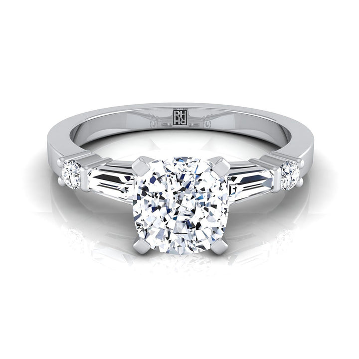 แหวนหมั้นเพชรคลาสสิกที่โดดเด่นด้วยเพชรทรงหมอนตรงกลาง ตกแต่งด้วยเพชรบาเก็ตทรงเรียวและเพชรเจียระไนแบบบริลเลียนต์ (h-i/vs 0.25 Ctw) ประดับอย่างสวยงามด้วยการฝังแบบแชนแนลและกรงเล็บในทองคำขาว 14 กะรัต