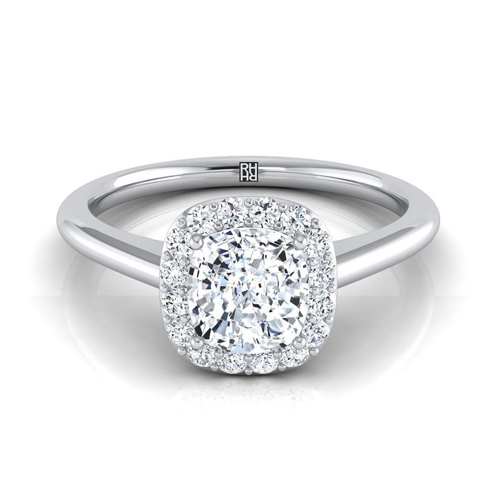 แหวนหมั้นแบบคุชชั่นคัทฮาโลพาเว่ที่แสดงถึงสไตล์คลาสสิกนี้ โชว์เพชรเจียระไนแบบบริลเลียนต์คัท (h-i/vs 0.20 Ctw) ที่ประดับอย่างสวยงามในตัวเรือนทองคำขาว 14 กะรัตแบบคลาสสิก