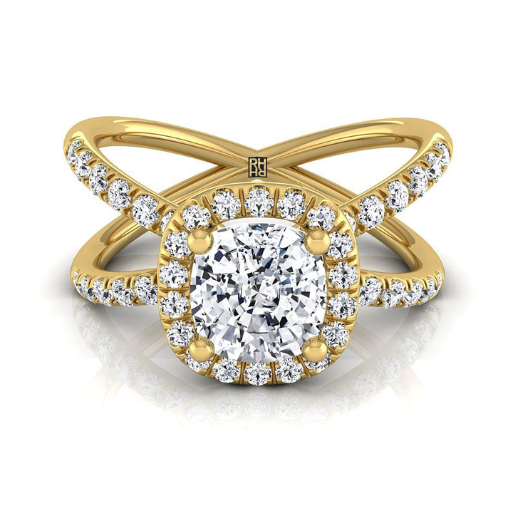 แหวนหมั้นเพชรทรงหมอนทองคำเหลือง 18K แบบไขว้เปิดฝรั่งเศสประดับเพชรปาเว่ - 1/2ctw