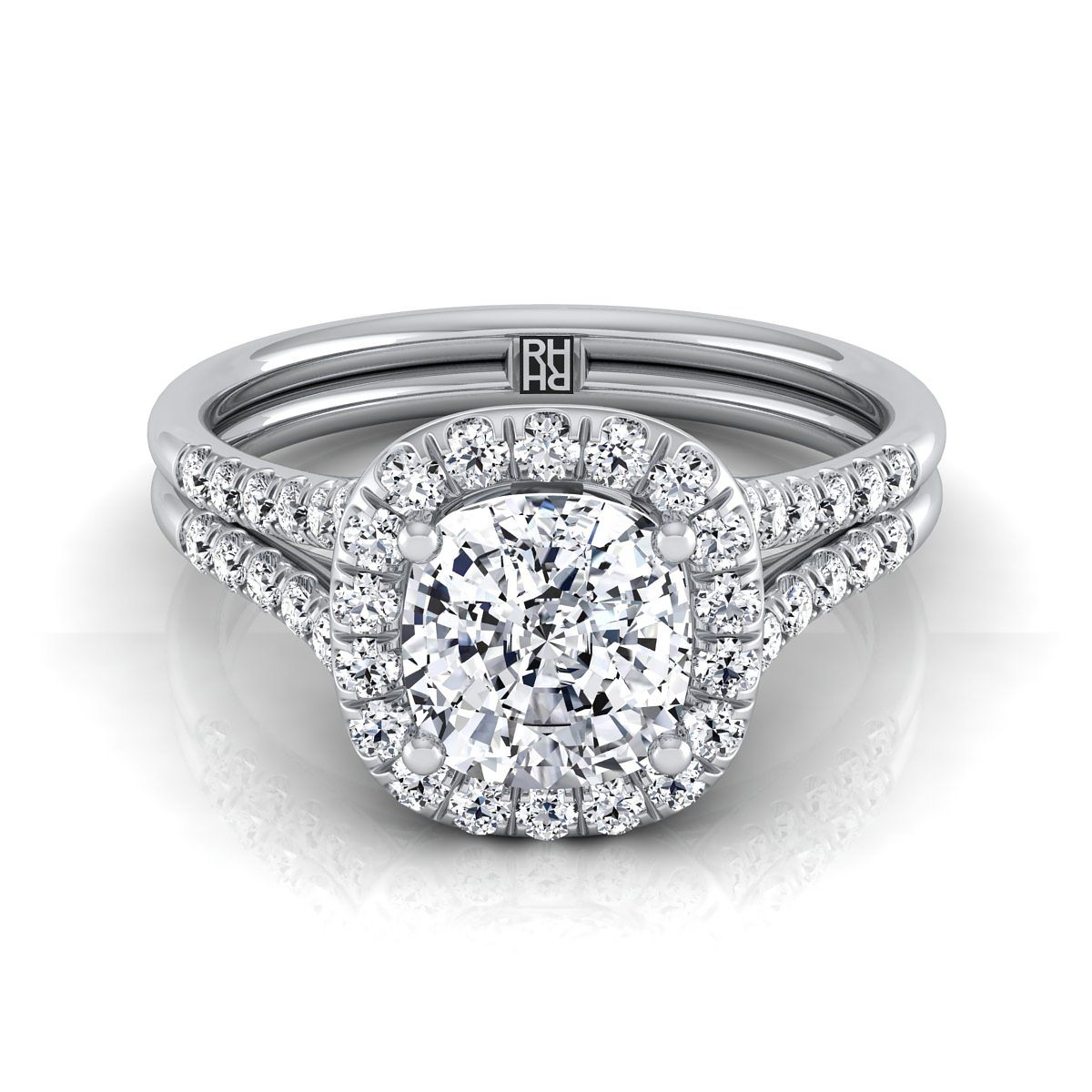 แสดงออกถึงสไตล์ที่สง่างาม แหวนหมั้นแบบคูชั่นคัทฮาโลพาเว่ที่มีแถวคู่ของแหวนแสดงเพชรเจียระไนแบบบริลเลียนต์คัท (h-i/vs 0.40ctw) ที่ประดับอย่างสวยงามในตัวเรือนแพลตตินัมคลาสสิก