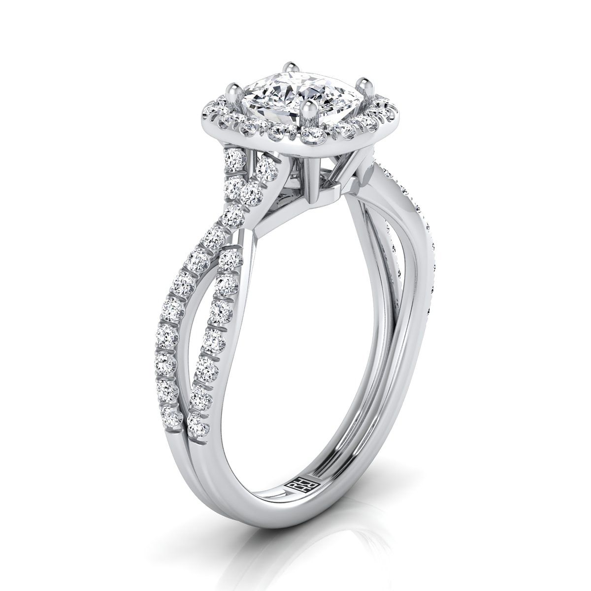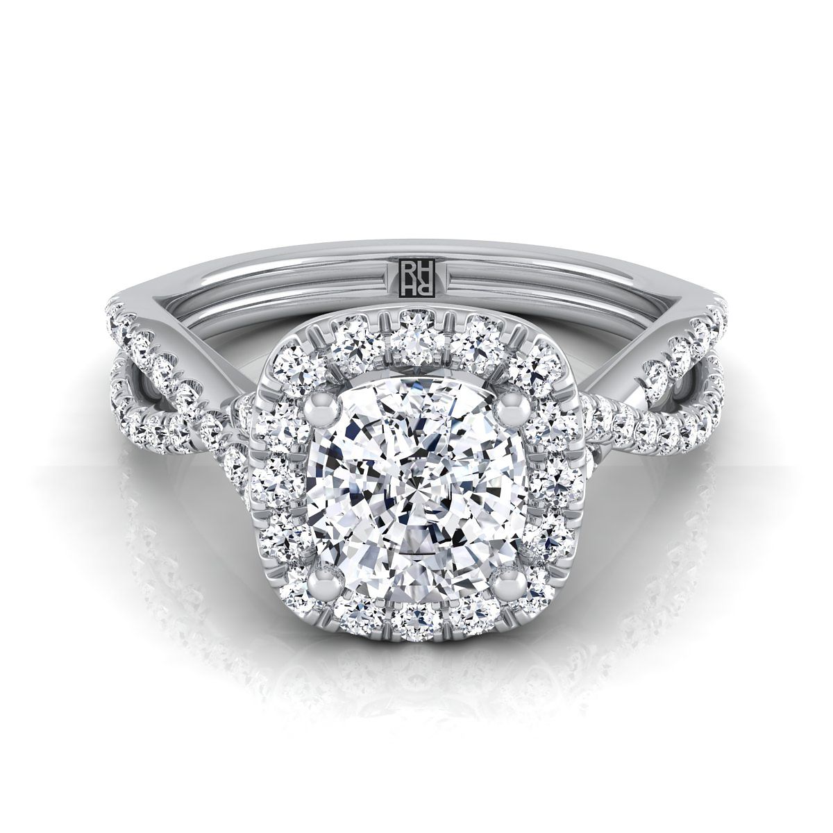 แหวนหมั้นกลางเพชรทรงหมอนทองคำขาว 14K ดีไซน์ขอบหยักบิดแบบ Pavé Halo น้ำหนักรวม 1/2 กะรัต