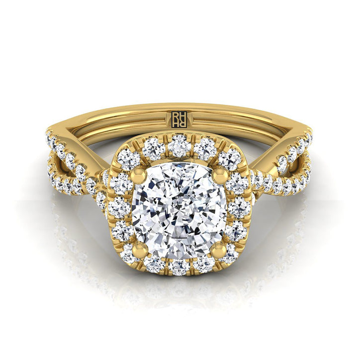 แหวนหมั้นกลางเพชรทรงหมอน 14K ทองเหลืองทองคำเหลืองแบบบิดขอบหยักประดับเพชร Pavé Halo - 1/2ctw