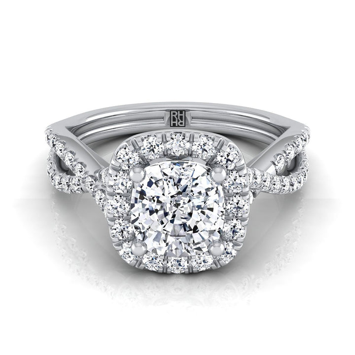 แถลงการณ์สไตล์สมัยใหม่ แหวนหมั้นแบบคัทคูชันฮาโลว์ปาเว่ พร้อมชิ้นส่วนอินฟินิตี้โชว์เพชรเจียระไนแบบบริลเลียนต์ (h-i/vs 0.50ctw) ติดตั้งในตัวเรือนแพลตตินัม