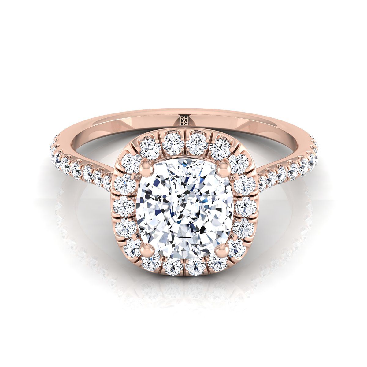 แถลงการณ์ที่สง่างามของสไตล์ แหวนหมั้นแบบฮาโล่ที่มีการตัดแบบคูชัน พร้อมแถบเพชรที่แสดงให้เห็นเพชรที่ตัดอย่างสวยงาม (h-i/vs 0.45ctw) ตั้งอยู่ในทองคำกุหลาบ 14k แบบคลาสสิก