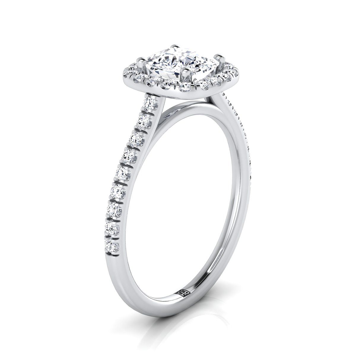 แหวนหมั้นสไตล์หรูหรานี้ที่มีรูปทรงหมอนและวงแหวนแบบฮาโลที่ประดับด้วยเพชรแบบปาเว่แสดงให้เห็นเพชรเจียระไนแบบบริลเลียนต์ (h-i/vs 0.30ctw) ที่ประดับอย่างสวยงามในตัวเรือนทองคำขาว 14 กะรัตแบบคลาสสิก