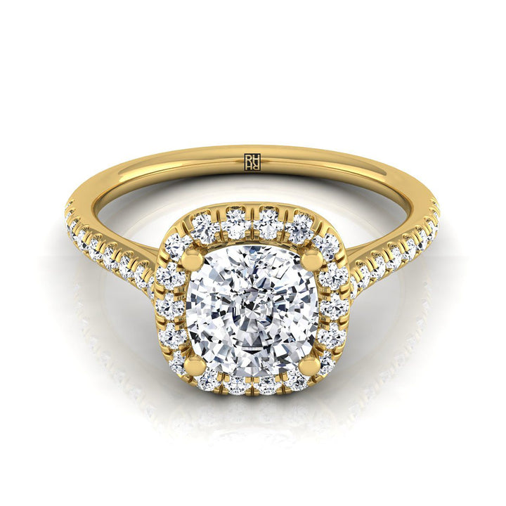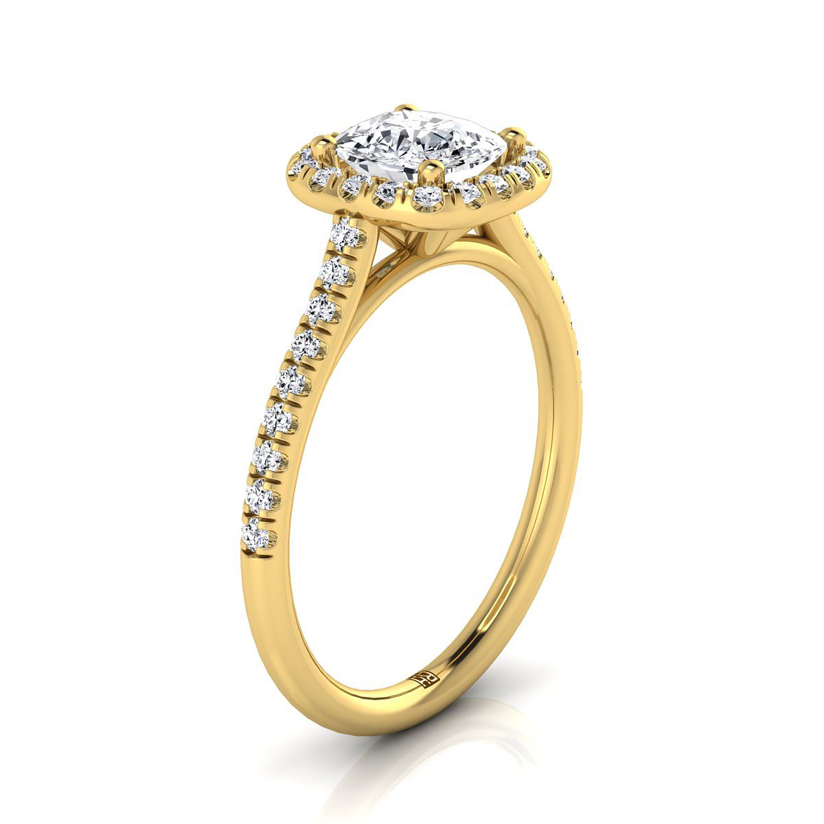 แสดงสไตล์อย่างสง่างาม แหวนหมั้นทรงหมอนแบบฮาโลที่มีเพชรประดับแบบเพฟชองค์แสดงให้เห็นเพชรเจียระไนแบบบริลเลียนท์คัต (h-i/vs 0.33ctw) ที่ประดับอย่างสวยงามในตัวเรือนทองคำเหลือง 18k คลาสสิก