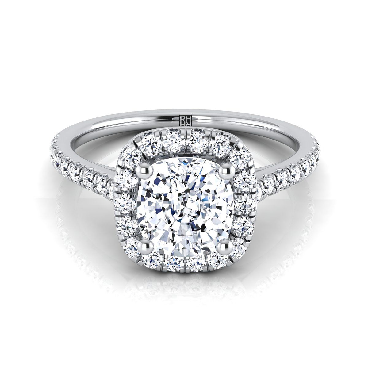 แสดงออกถึงสไตล์ที่สง่างาม แหวนหมั้นทรงหมอนแบบฮาโลที่มีเพชรประดับแบบเพฟชองเพชรเจียระไนแบบบริลเลียนต์ (h-i/vs 0.30ctw) ประดับอย่างสวยงามในตัวเรือนแพลตตินัมคลาสสิก