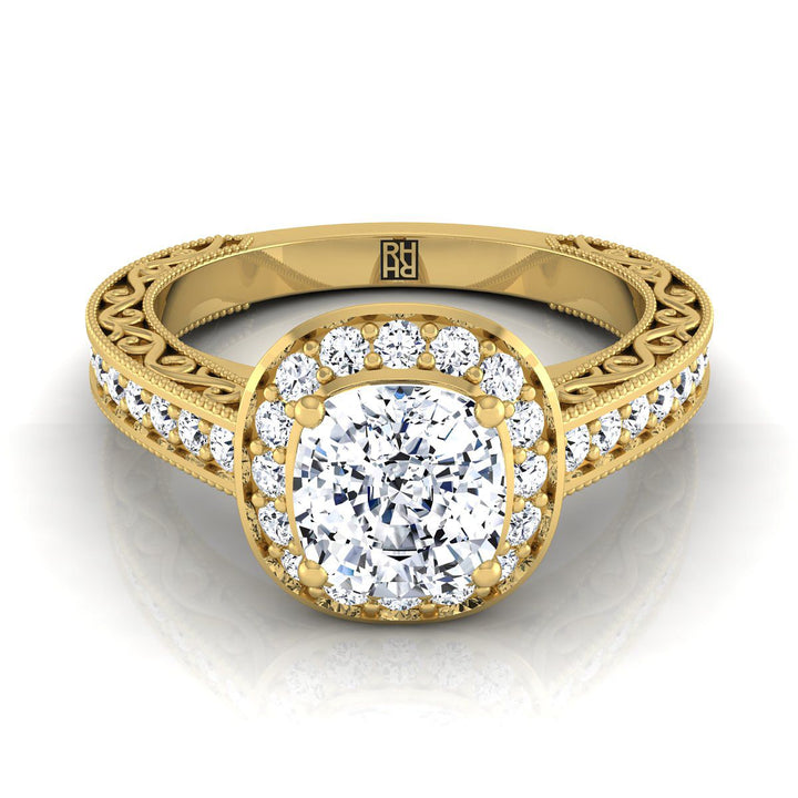 แสดงสไตล์อย่างสง่างาม แหวนหมั้นทรงหมอนแบบฮาโลที่มีดีไซน์ช่างแกะสลักแสดงให้เห็นเพชรเจียระไนแบบบริลเลียนต์ (h-i/vs 0.55ctw) ประดับในตัวเรือนทองคำ 18 กะรัตสีเหลือง