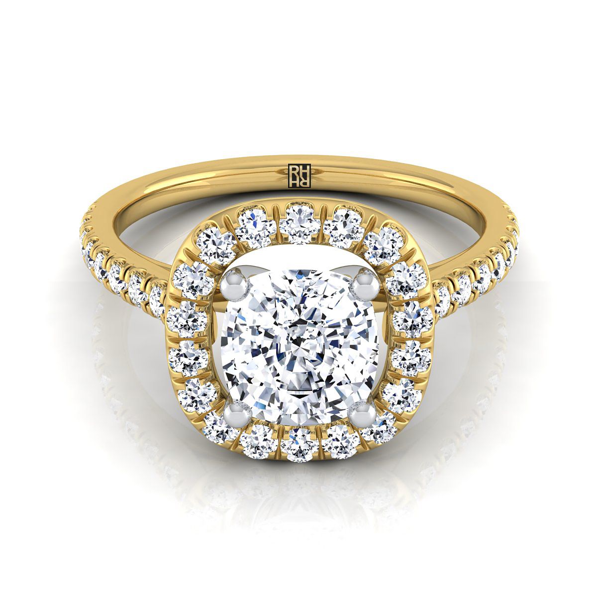 คลาสสิกและสง่างาม แหวนหมั้นเพชรทรงหมอนแบบ Halo นี้พร้อมชิ้นส่วนแถวเพชรแบบ Pave โชว์เพชรเจียระไนแบบ Brilliant Cut (h-i/vs 0.50ctw) ที่ประดับอย่างสวยงามในตัวเรือนทองคำเหลือง 14k แบบคลาสสิก