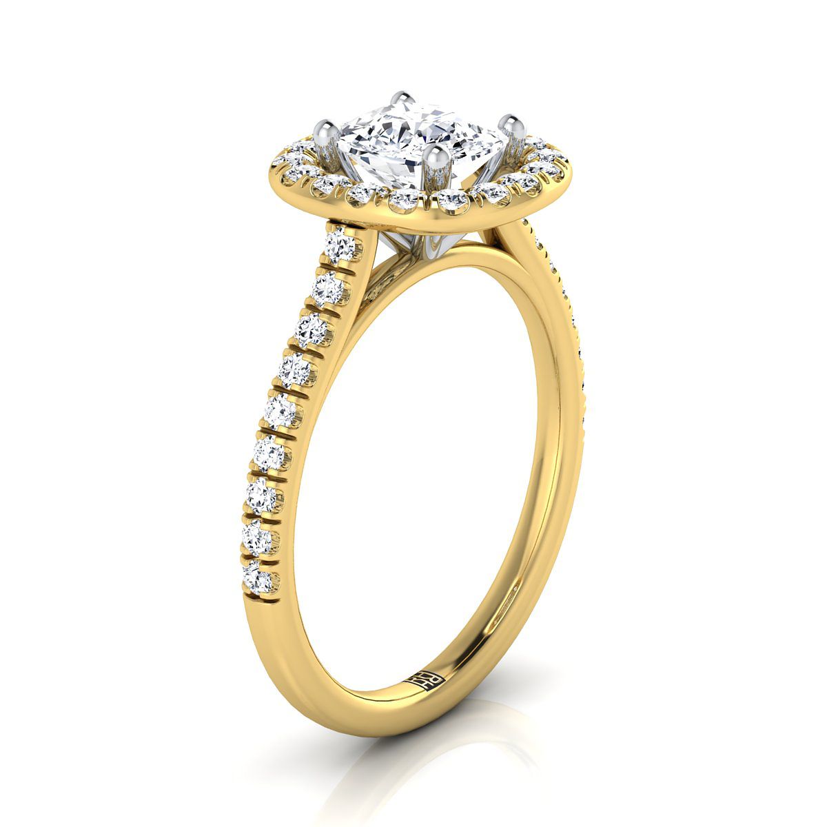 แหวนหมั้นทองคำเหลือง 14K ทรงหมอน ประดับเพชรแบบฝรั่งเศสเรียบง่าย พร้อมฮาโลพาเว่ - 1/2 กะรัตรวม
