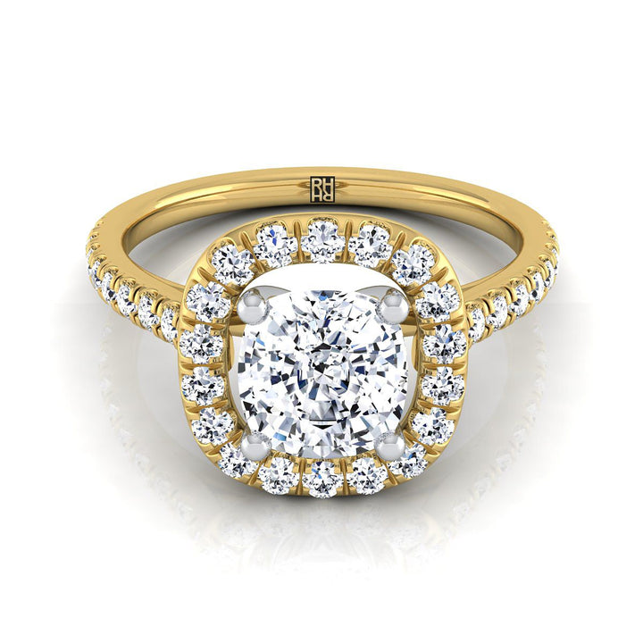แหวนหมั้นทองคำเหลือง 18K ทรงหมอน ประดับเพชรแบบฝรั่งเศสเรียบง่าย พร้อมฮาโลพาเว่ - 1/2 กะรัตรวม