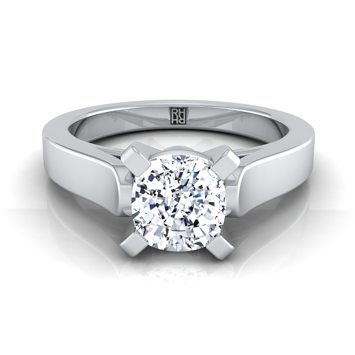 ความสง่างามที่เรียบง่าย แหวนหมั้นเพชรเม็ดเดี่ยวทรงหมอนนี้นำเสนอการตั้งศูนย์แบบวิหารพร้อมขอบแบนขัดเงาสูงในทองคำขาว 14 กะรัต