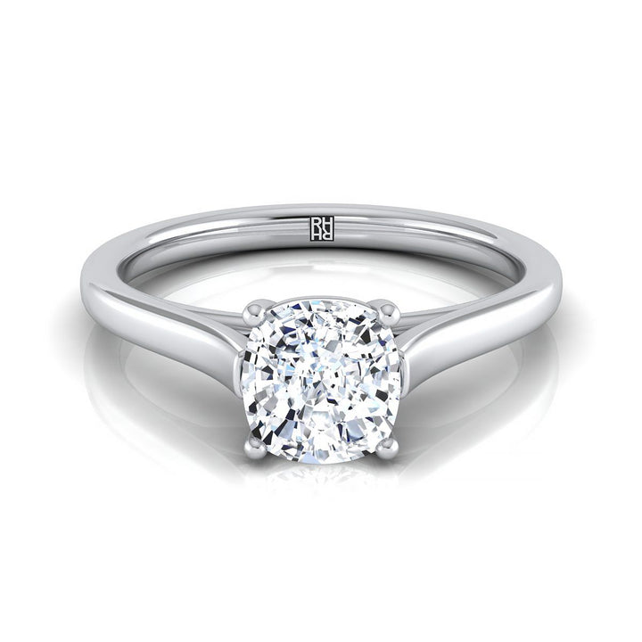 แหวนหมั้นเดี่ยวทรงหมอนสุดคลาสสิกนี้แสดงให้เห็นถึงขอบแหวนทรงสี่เหลี่ยมและการตั้งแบบวิหารในทองคำขาว 14 กะรัต