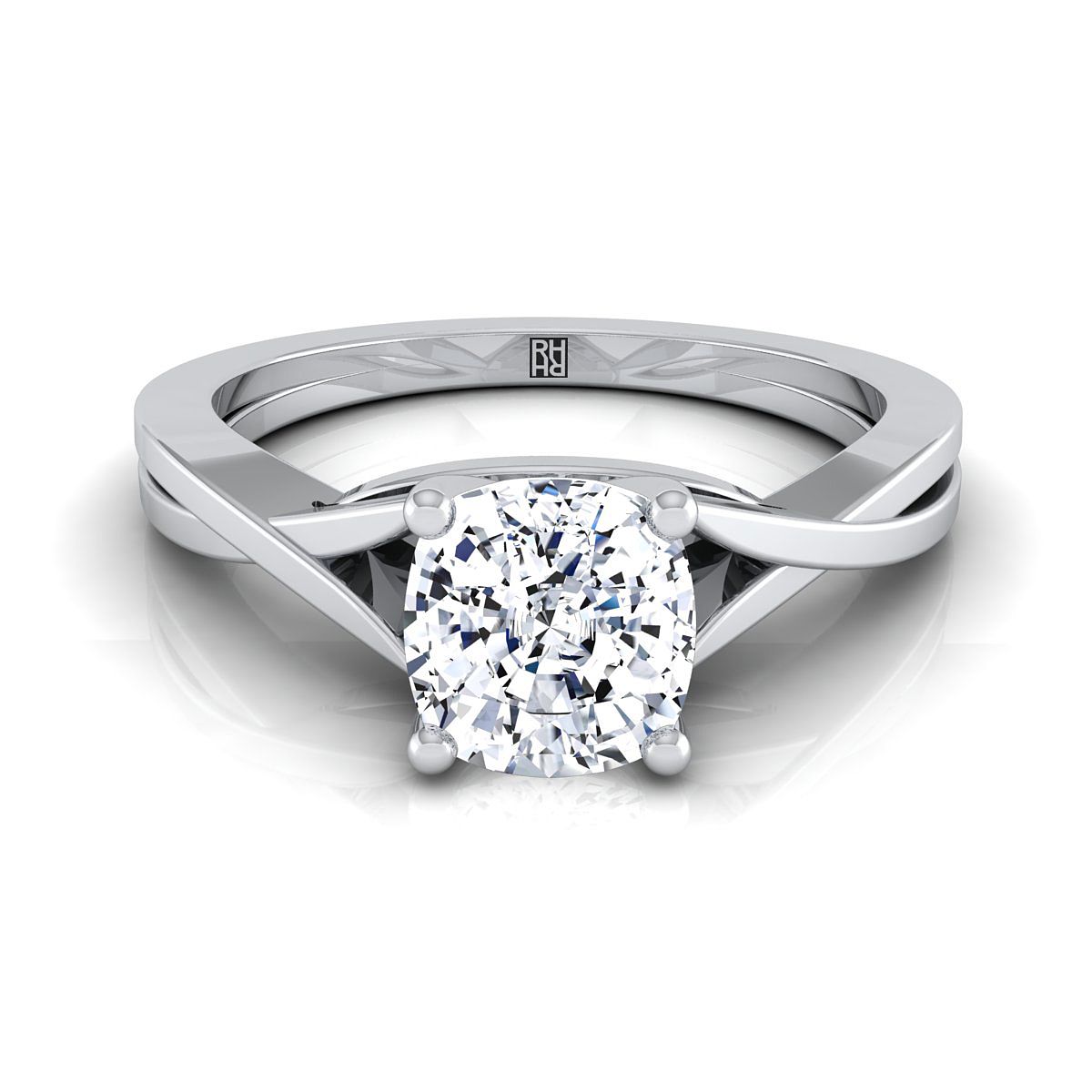 ความสง่างามที่เรียบง่าย ตัวเรือนแหวนหมั้นเพชรทรงหมอนนี้มีดีไซน์แบบโบสถ์คลาสสิก พร้อมก้านแหวนบิดเกลียวในทองคำขาว 14 กะรัต