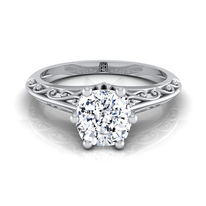 ความสง่างามที่เรียบง่าย แหวนหมั้นเพชรทรงหมอนนี้แสดงให้เห็นถึงแถบวงแหวนที่ค่อยๆ เพิ่มระดับพร้อมลวดลายสลักแบบม้วนในตัวเรือนทองคำขาว 18 กะรัตคลาสสิก