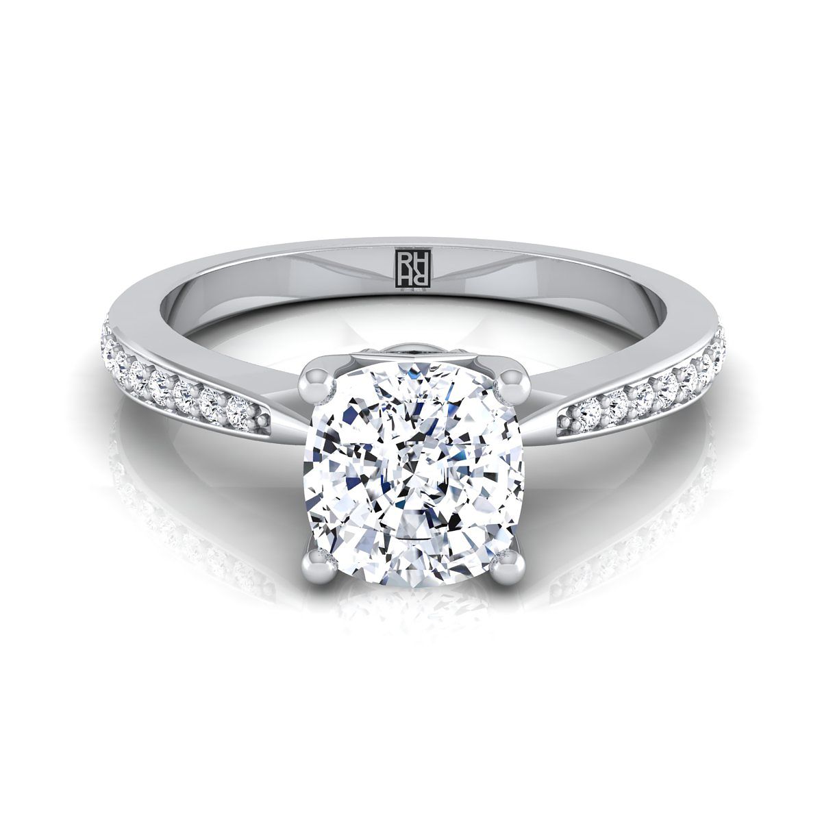 คลาสสิกและสง่างาม ตัวเรือนแหวนหมั้นเพชรทรงหมอนนี้แสดงให้เห็นถึงเพชรเจียระไนแบบ Brilliant Cut (h-i/vs 0.125ctw) ที่ประณีตฝังแบบปาเว่ในทองคำขาว 14 กะรัต