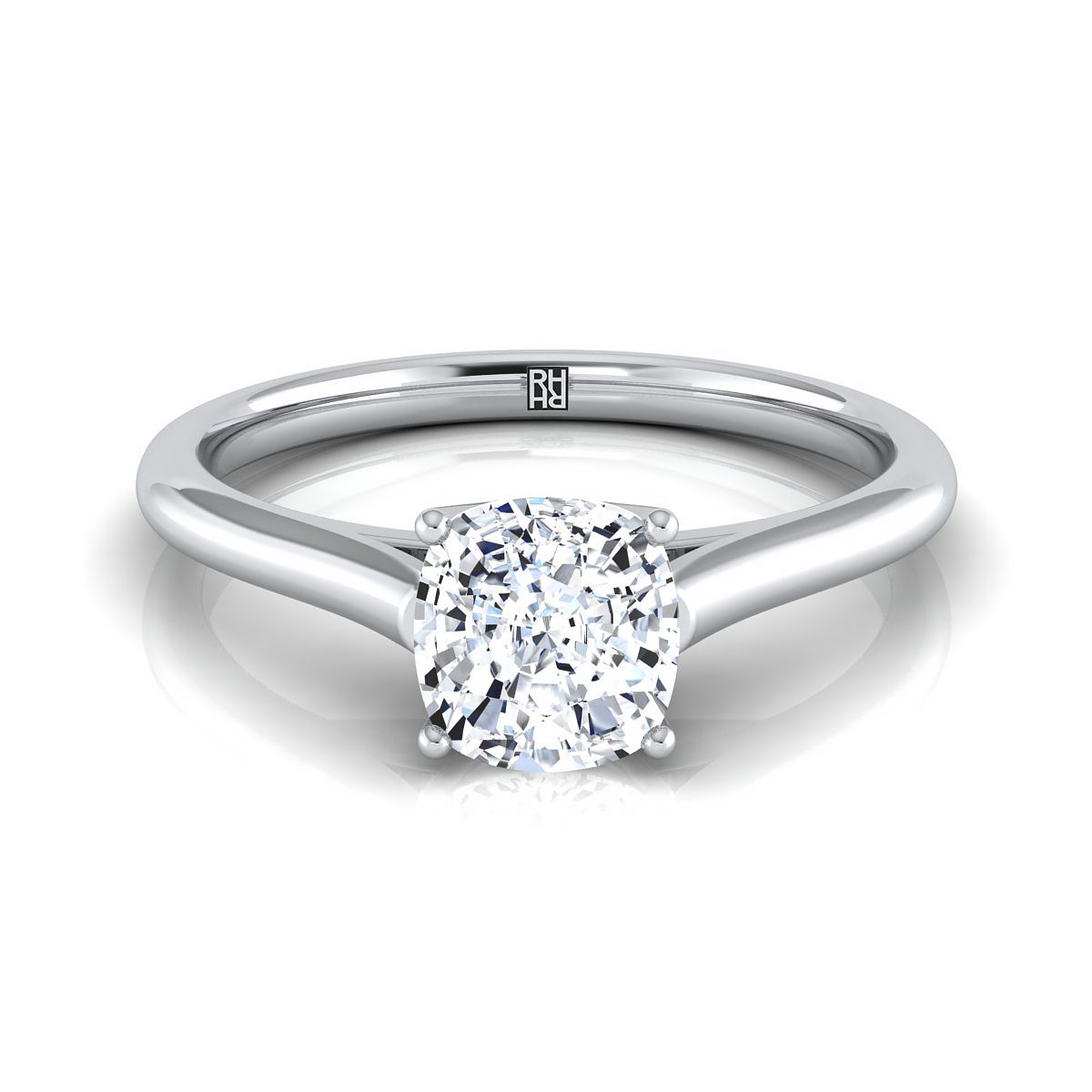 แหวนหมั้นเพชรทรงหมอนที่ประณีตอย่างยอดเยี่ยมนี้ โชว์เพชรทรงหมอนพร้อมก้านแหวนโค้งมนและการตั้งแบบวิหารในทองคำขาว 14 กะรัต