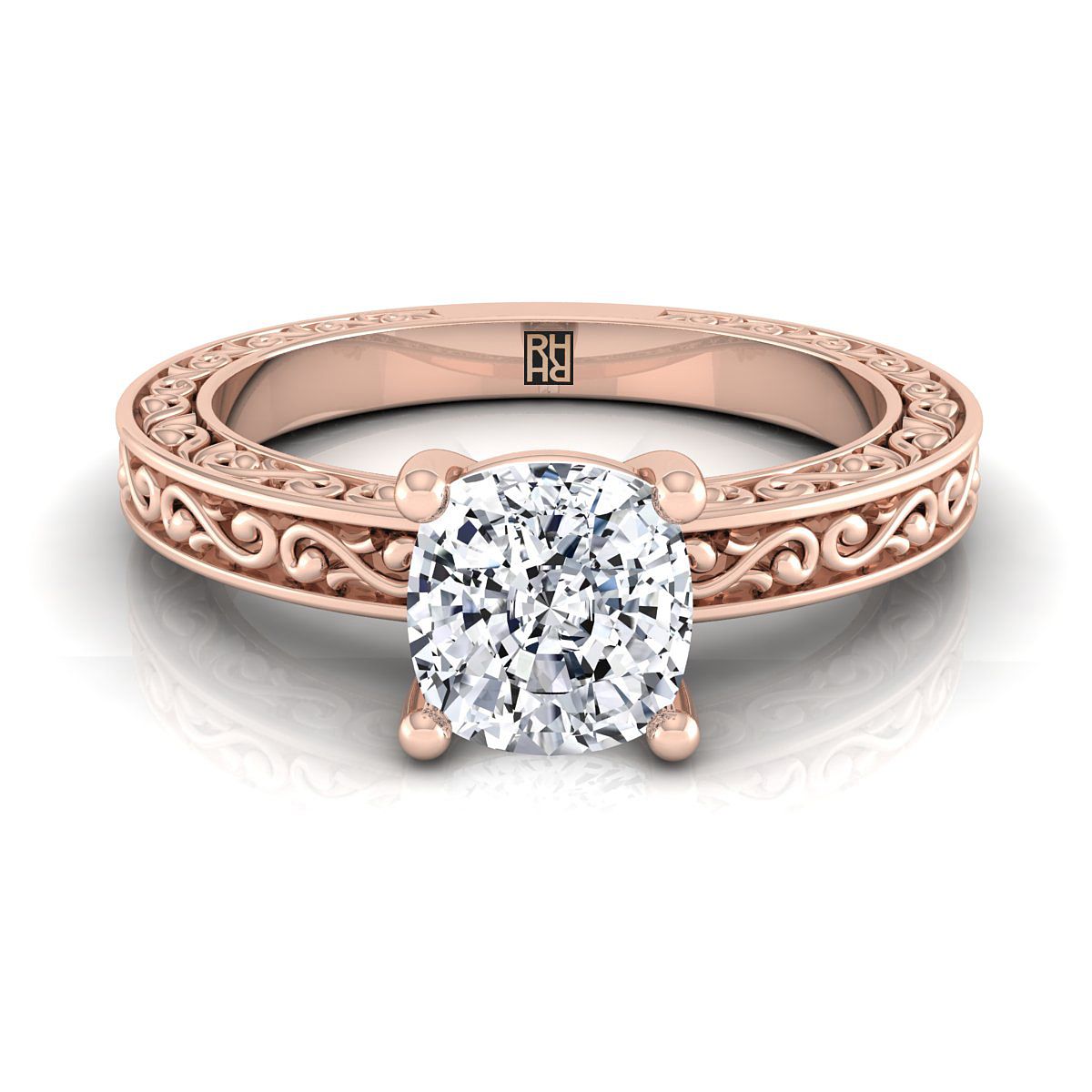 ความสง่างามที่เรียบง่าย แหวนหมั้นเพชรทรงคุชชั่นนี้มีการออกแบบลวดลายสลักแบบเกลียวบนตัวแหวน พร้อมการขัดเงาแบบคลาสสิกในทองคำกุหลาบ 14k