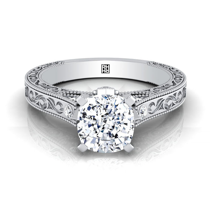 ความสง่างามที่เรียบง่าย แหวนหมั้นเพชรทรงหมอนนี้แสดงให้เห็นถึงลวดลายสลักแบบม้วนบนวงแหวนพร้อมกับการขัดเงาสูงแบบคลาสสิกในทองคำขาว 18 กะรัต