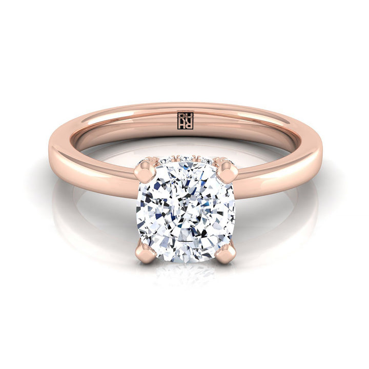 คลาสสิกและสง่างาม แหวนหมั้นนี้มีการแสดงผลที่โดดเด่นด้วยการตัดแบบคูชั่นที่มีเพชรเดี่ยวซึ่งถูกเน้นด้วยเพชรที่ตัดอย่างยอดเยี่ยมที่ถูกตั้งอยู่ในทองคำกุหลาบ 14k