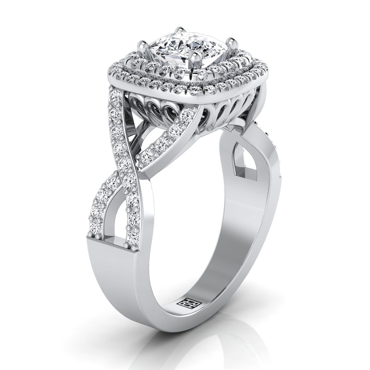 แหวนหมั้นเพชรทรงหมอนบิดเกลียวฝรั่งเศสประดับเพชรแบบดับเบิลฮาโลว์ทองคำขาว 14K - 5/8ctw